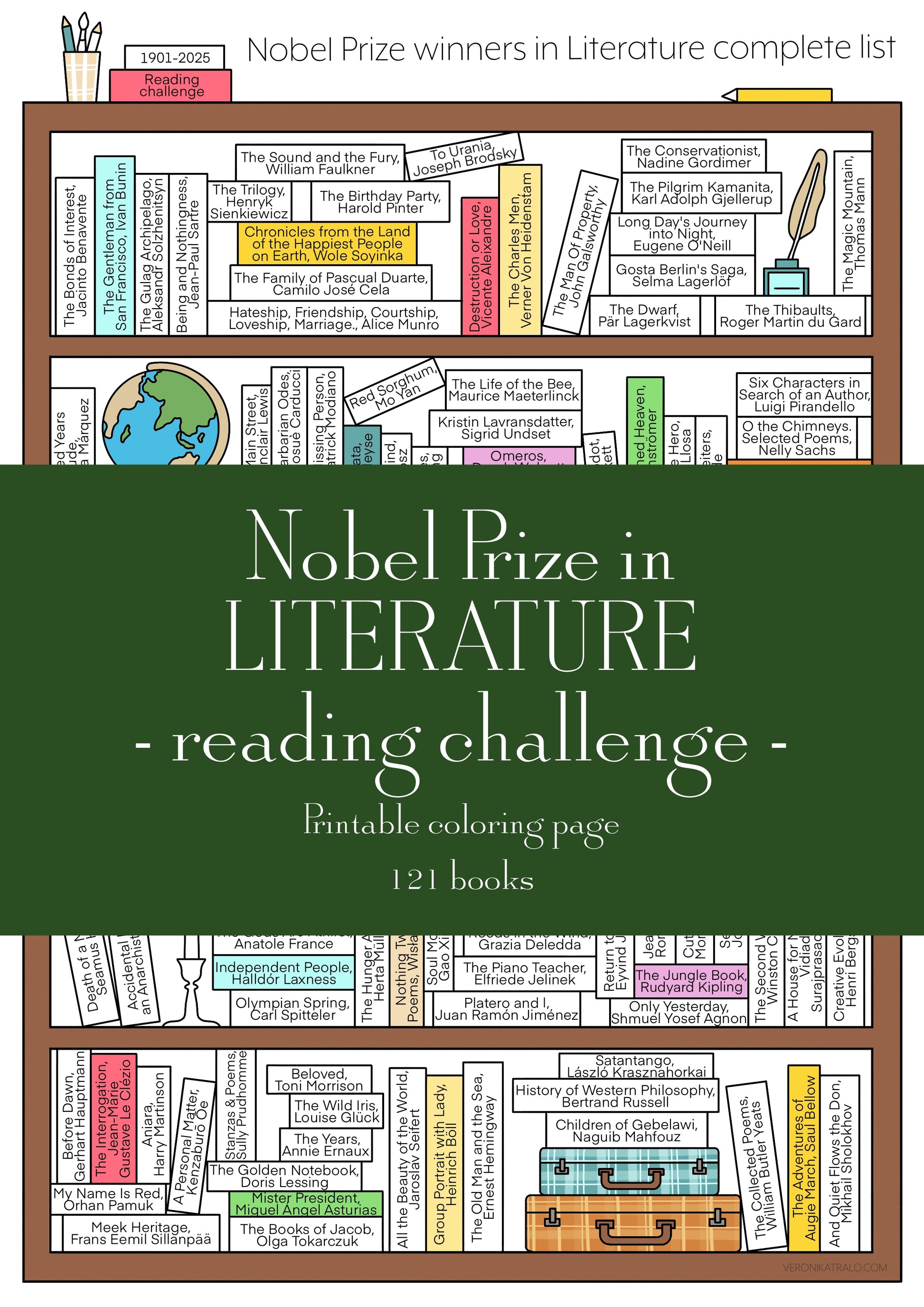 Nobel Prize Laureates in Literature are normally awarded for the author's life work. This list is based on magnum opuses (masterpieces) of each writer. Designed for everyone who would like to join this challenge and track their progress in a beautiful way (by colouring books they’ve read on the shelf)